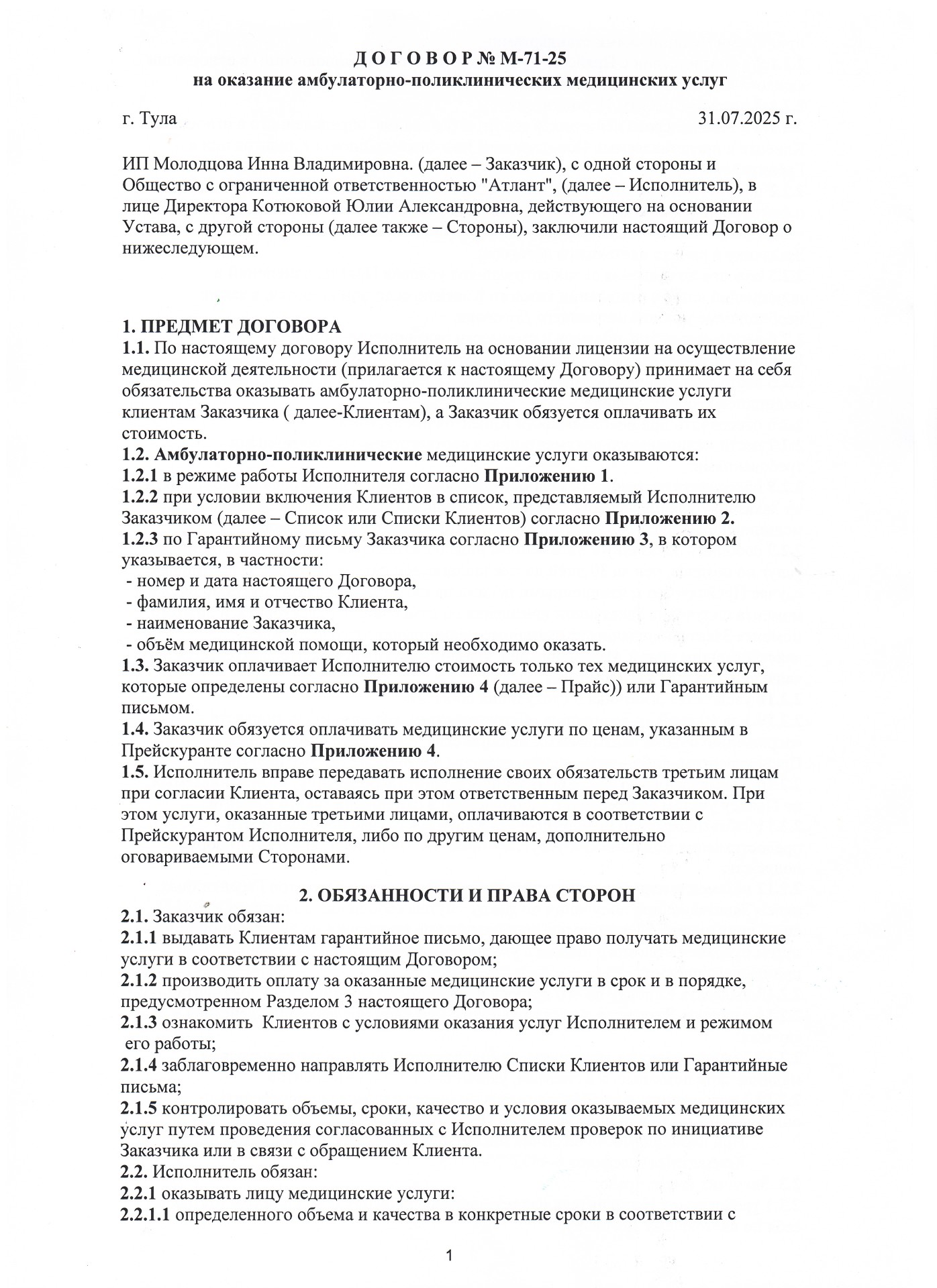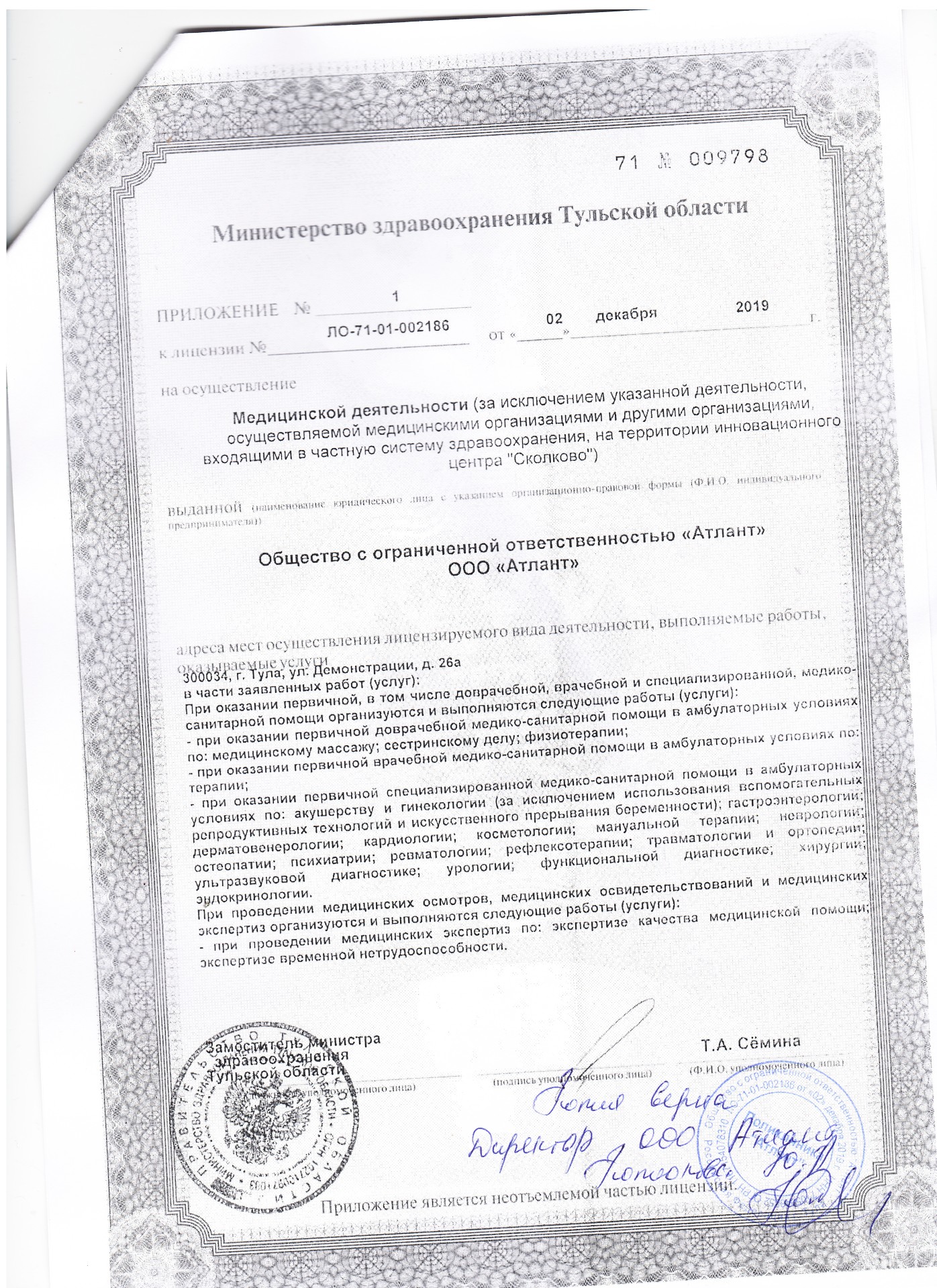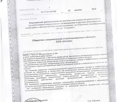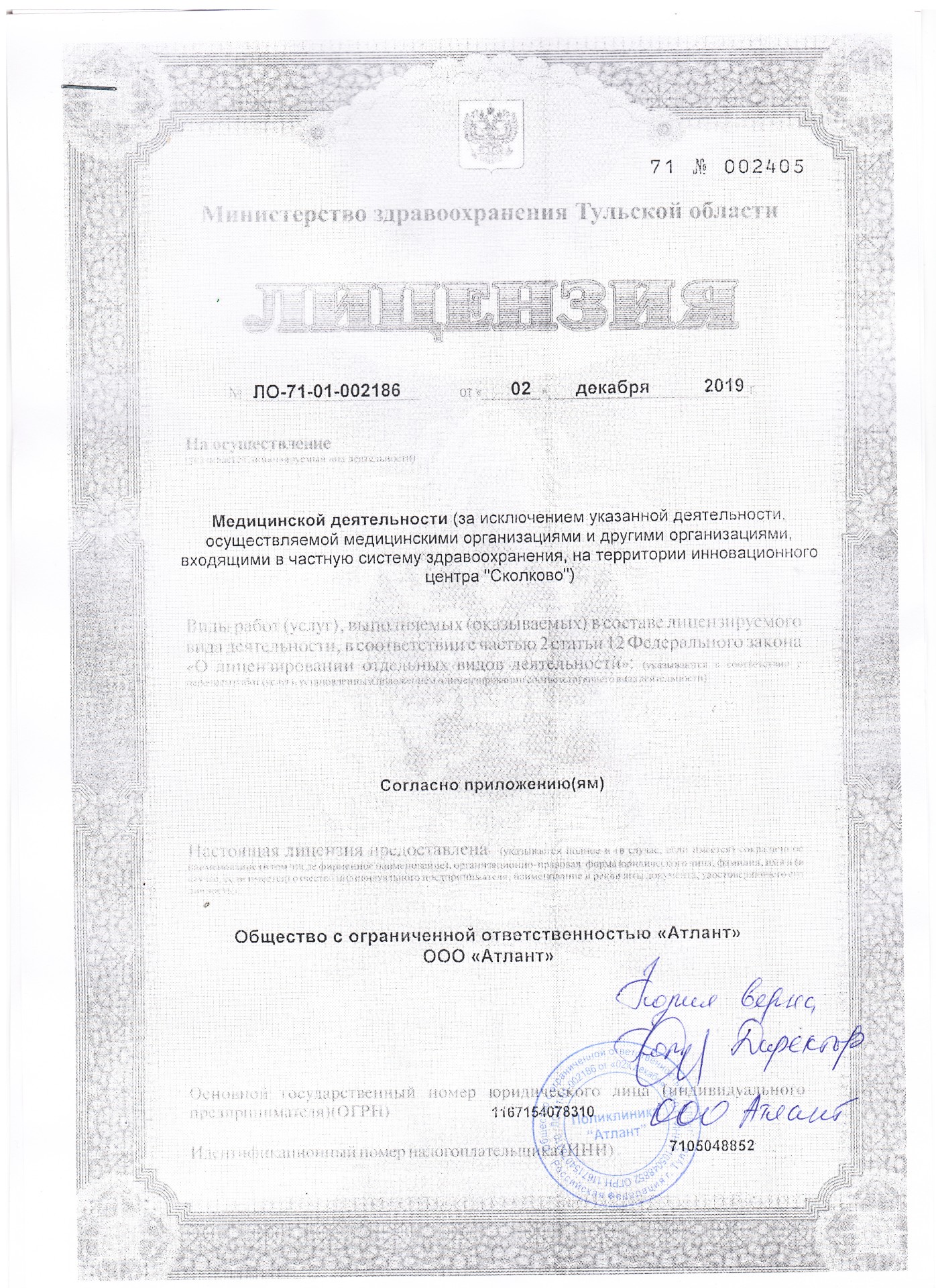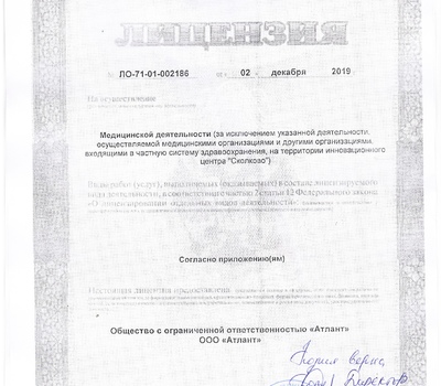Медицинские услуги оказываются Партнером (ООО «Атлант» номер лицензии ЛО-71-01-002186, дата выдачи лицензии: 2 декабря 2019 г.)